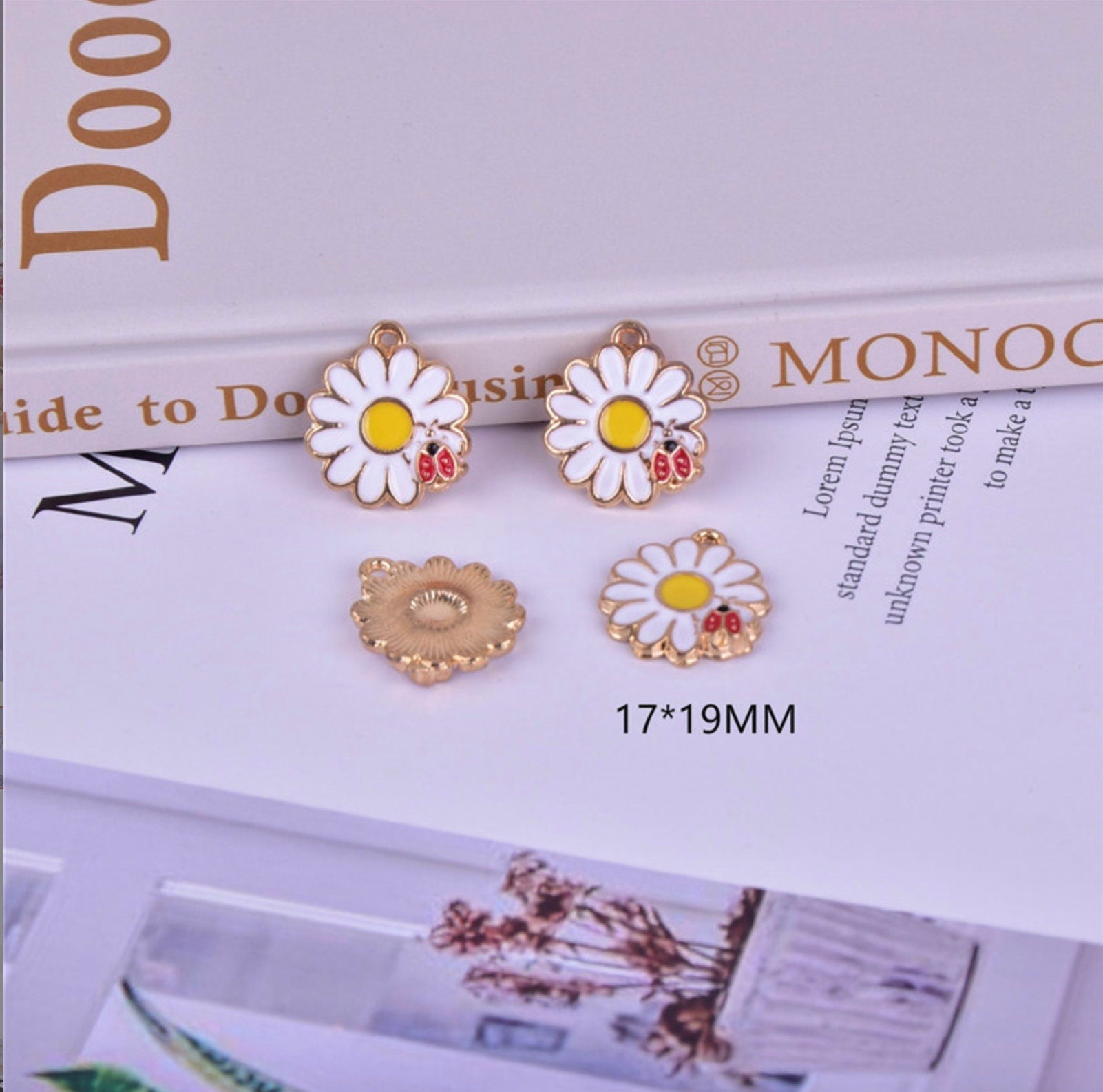 Cute White Daisy with Ladybug Enamel Charm (17mm x 19mm)